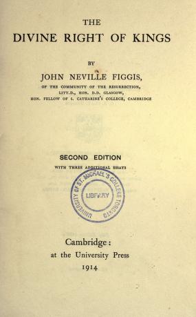 J.N. Figgis, Divine Right of Kings (1896): The main argument, as Runciman characterises it, is that modern political life, unlike earlier eras, is free of absolute claims to authority, from either the church or the state, and is characterised instead by plural authority, plural commitments.