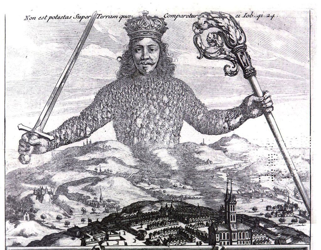 Hobbes named his book ‘Leviathan’ after a colossal, terrifying sea monster. The frontispiece of the book – what we call the front cover today – is an enormous king towering above hills, cities and churches, dominating the horizon, sword in one hand and what looks like a sceptre in the other. A titan, armed and looming over the land. This is Hobbes’ feverish image of the ‘someone’ who would keep the peace. So why this someone? Hobbes wanted his peacekeeper to be so powerful, so dominant, so monstrous that nobody, not even the most principled or power hungry groups would think of crossing him. He had to be armoured in the strongest possible fashion to avoid the worst possible eventuality, civil war, by having ‘undivided, unlimited’ power over the machinery of the state, its war-making and tax-raising functions, centring power in one literal body below which everything else would feel small and subordinate.