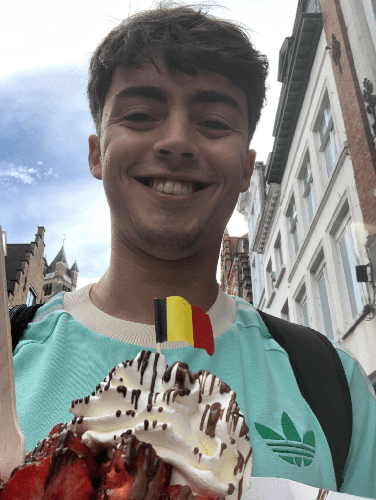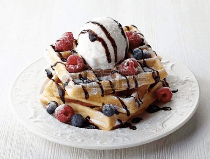 She draws her cart to a halt. She pauses, then plunges her great fists into her pockets and draws out two balls of dough, one stretchy, one thick. In each hand she kneads them. The crowd’s eyes dart this way and that, watching her fold in Belgian pearl sugar and vanilla extract, then slap each ball down into the jolty griddle on the rickety cart beside her. She shuts it: the dough sizzles, it cooks, it grows firm, its edges hardened. Now it turns gold, now its edges tinge brown. The smell thickens and then, in a flash, she flips it open. Light pours out: thick ridges of dough, deep pockets between them, square after square. The people drool, their wild eyes ablaze. Arms outstretched, tongues lolling out their mouths, they press forwards. Inside, the judges storm down the stairs, tripping over each other in their rush to this great lady outside. She raises her chin proudly. Onto these walls and squares of dough, she begins her dread work: a soft stream of caramel; a sprinkle of powdered sugar; a handful of fresh raspberries; double cream; whipped cream! Nutella! Sliced Bananas! Cinnamon! Hot Chocolate Sauce! Golden Syrup! Maple Syrup! Cinnamon! Fudge! Lathered, layered, dolloped! All furnishings, all dressings upon the great foundation underneath, those hearty squares and rows that sit clothed in the messiest cloth that Flanders and Walloon ever conceived of, the golden brown vessel for these delights – the Mighty Liege Waffle, the Whopping Brussels Waffle!